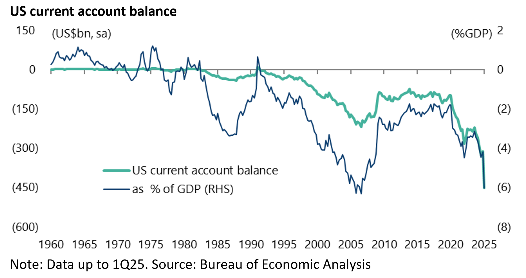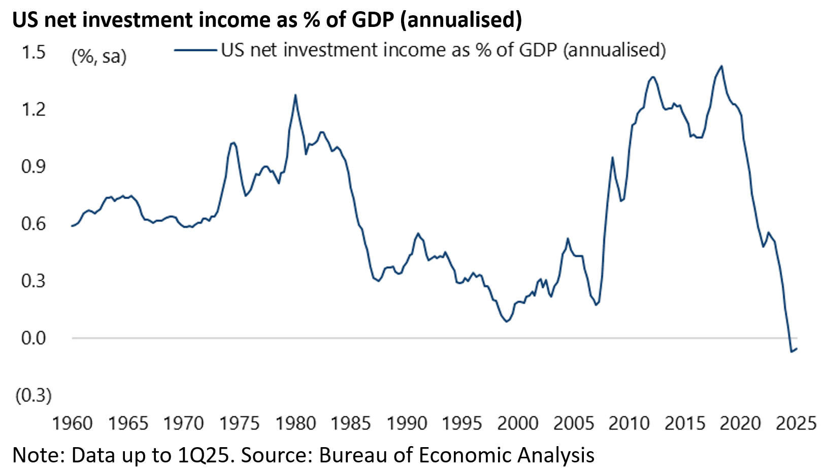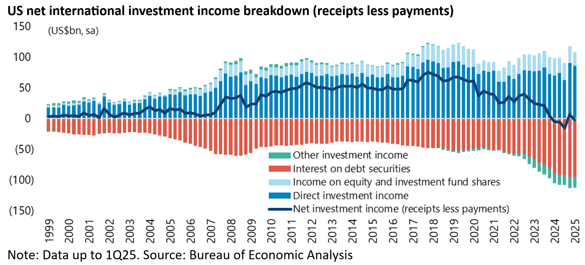 By contrast, net direct investment income has averaged US$75.9bn per quarter since 4Q23, while average quarterly net interest payments on debt securities have risen to US$90.4bn over the same period reflecting higher bond yields.
