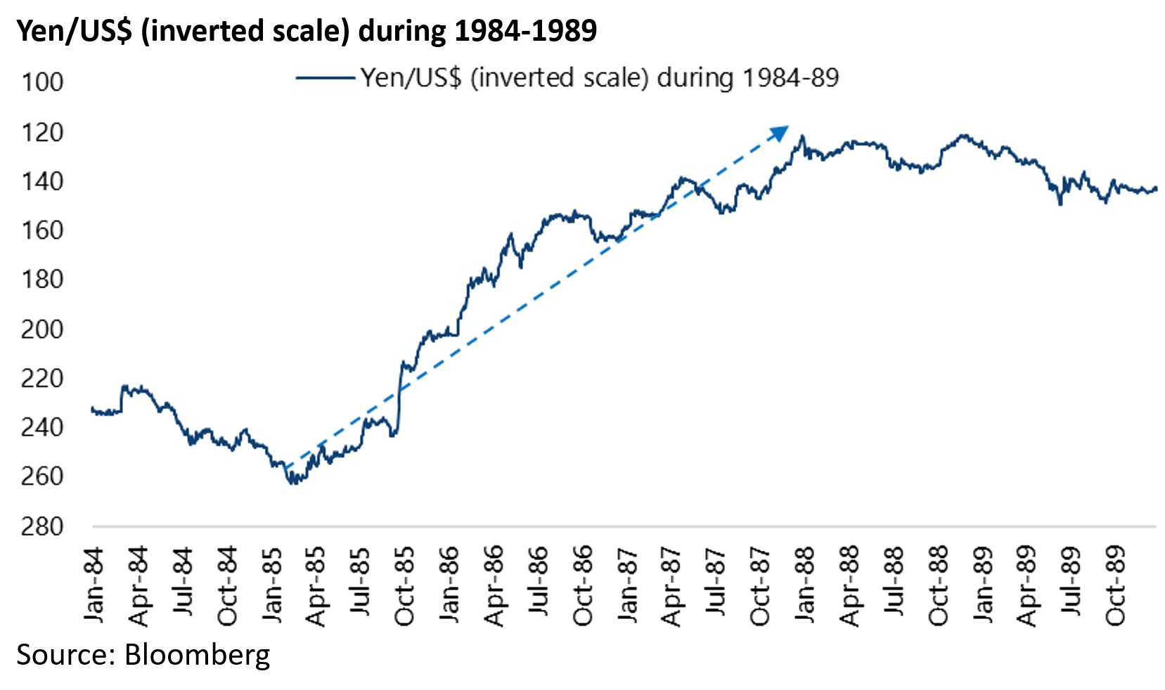An example is the 117% appreciation of the yen against the US dollar in a 34-month period between February 1985 and December 1987 following the Plaza Accord of 1985 when the yen rose from Y263/US$ to Y121/US$.