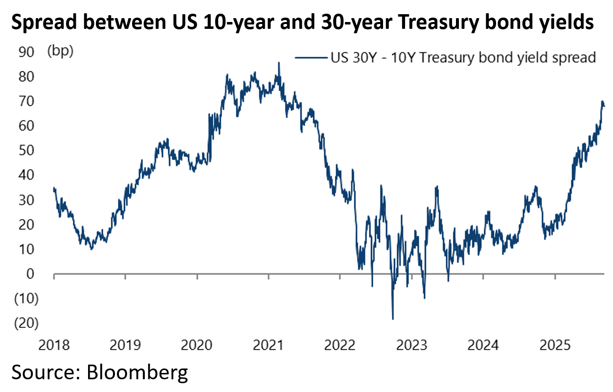 The divergence between the 10-year and the 30-year Treasury bond yields is now a wide 68bp after reaching 70bp on 2 September, the highest level since May 2021.