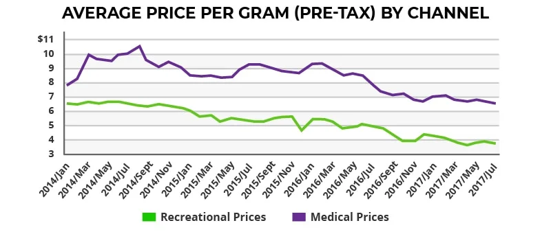 Fast forward to 2017. From the per gram data available in the chart below, recreational prices have fallen over 56% in 4 years to $6.92/gram and ended 2017 at only $5/gram, according to BDS Analytics, while the medical price is down 53% to $4.20/gram, which also saw the same price compression. Even though some buyers are willing to pay a premium for certain strains, competition is still driving the average retail price down day after day after day.
