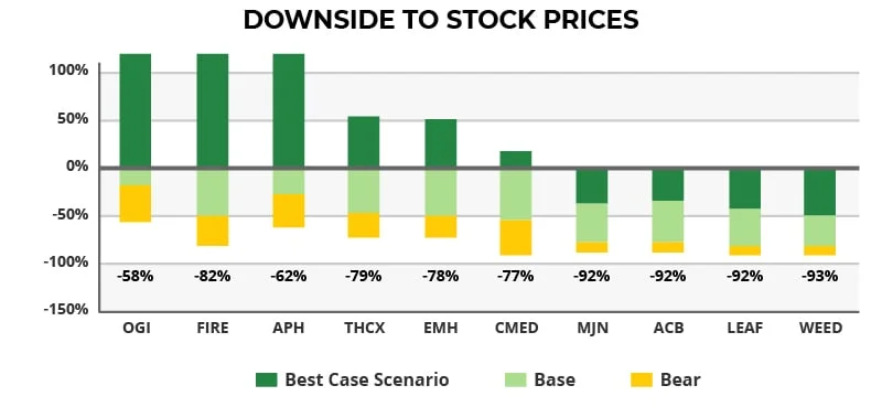 IN THIS REPORT WE ARGUE THAT AN INDUSTRY LIKE MARIJUANA WITH LITTLE PRICING POWER AND MINIMAL BARRIERS TO ENTRY SHOULD TRADE MORE IN LINE WITH COMMODITY PRODUCERS AT 5-6X EV/EBITDA, REPRESENTING BASE CASE DOWNSIDE TO STOCKS OF UP TO 65%.