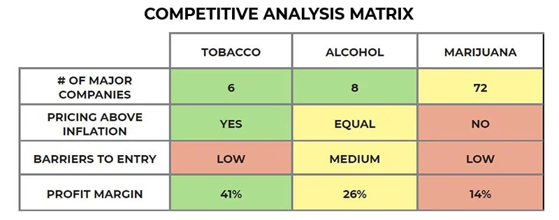 In contrast, the marijuana industry has built no brand awareness and sells a product that some may argue is habit forming, but is nowhere close to as addictive as nicotine in cigarettes. The industry is still wide open to competition and has the added threat of home growing and the black market to keep a cap on prices.
