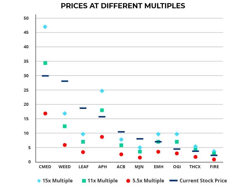 To see how big a difference the multiple makes, here are the implied stock prices for the top 10 marijuana producers when we use a 15x multiple in line with wine and spirits manufacturers, 11x in line with tobacco producers and, finally, a 5.5x multiple in line with commodity producers globally.