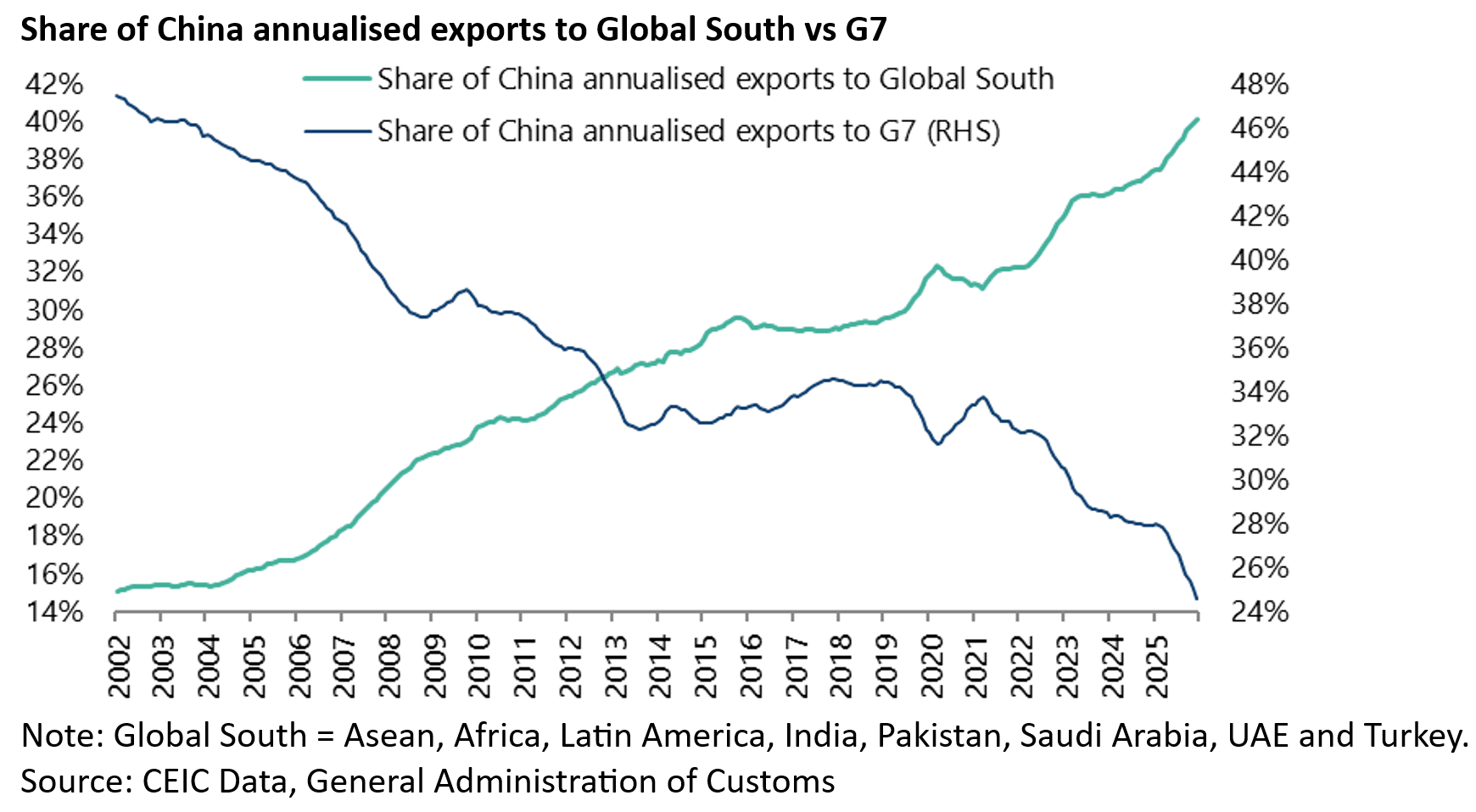 While China’s annualised exports to the Global South have increased from US$772bn in June 2020 to US$1.514tn in December 2025.