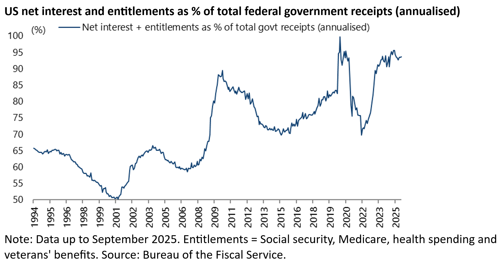 Net interest payments and entitlements were still running at 93.7% of total federal government receipts in the 12 months to September.