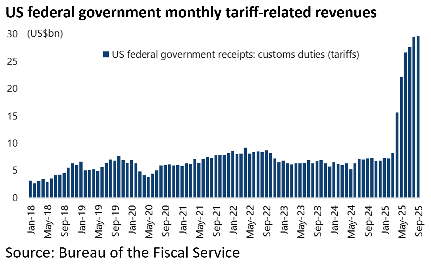 Still tariff-related revenues are up from US$7.25bn in February to a record US$29.7bn in September 2025 and were US$151.3bn in April-September 2025.