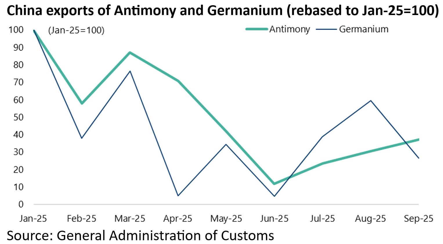 Exports of antimony and germanium have declined by 63% and 73% respectively as of September compared with their January levels.