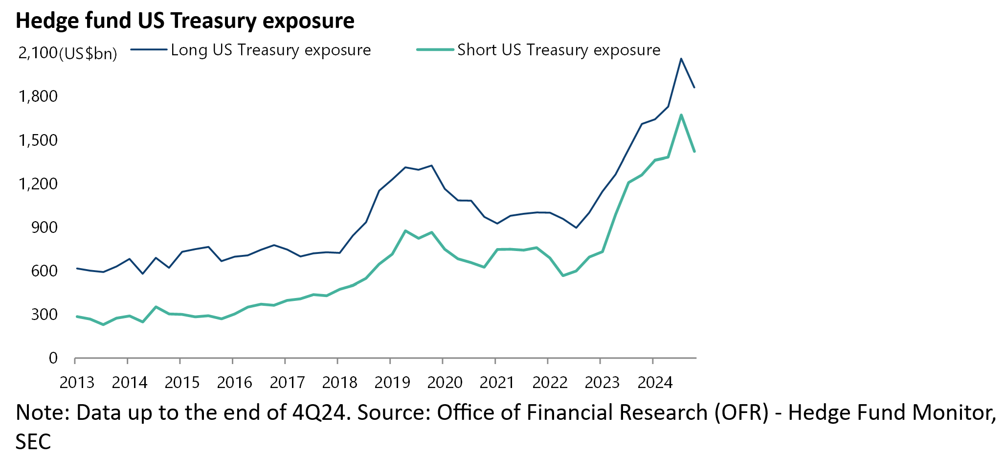 On this point, hedge funds’ long and short US Treasury exposures have increased from US$1.0trn and US$694bn respectively at the end of 2022 to US$1.86trn and US$1.42trn at the end of 2024, according to the Office of Financial Research.