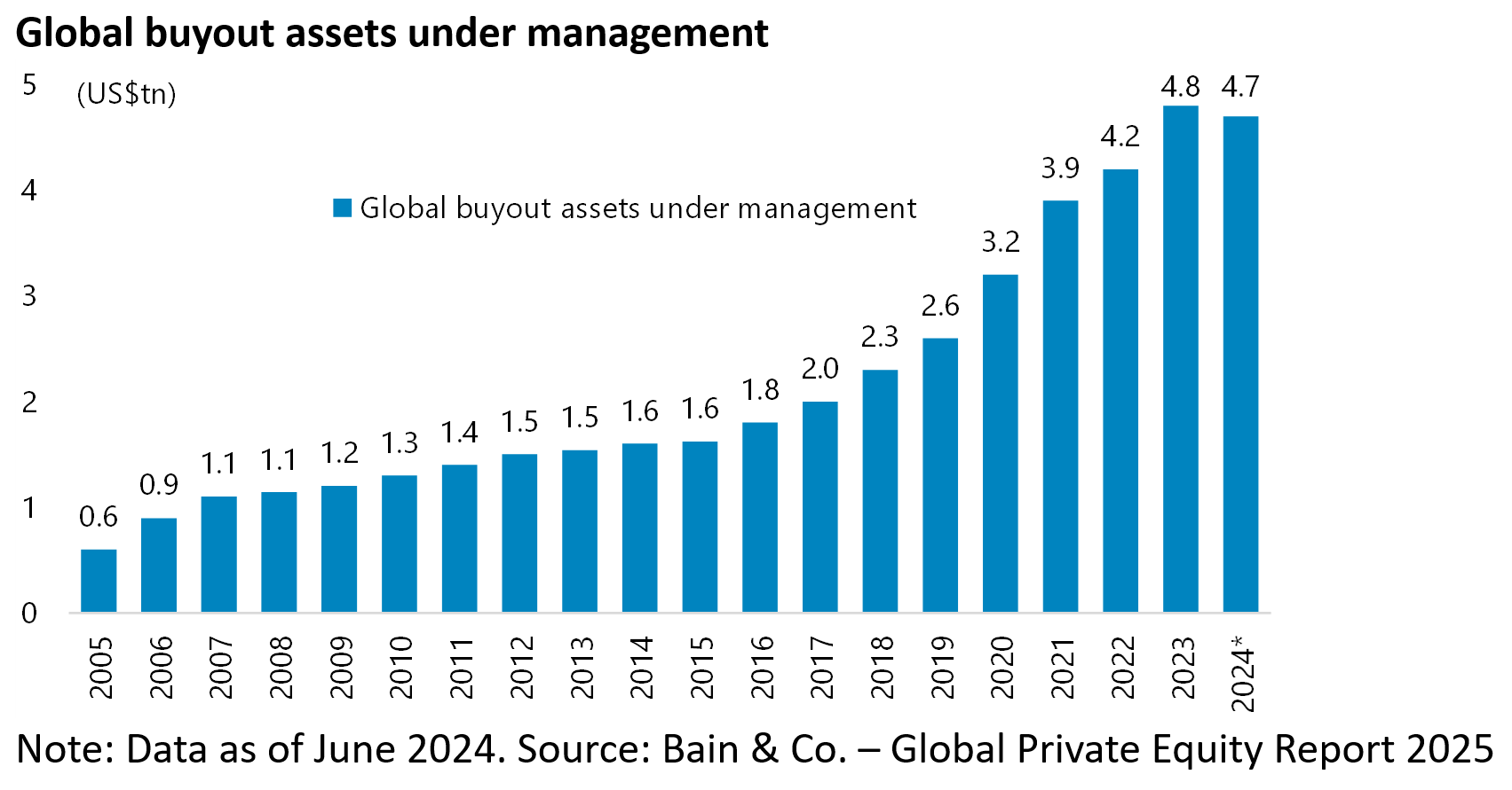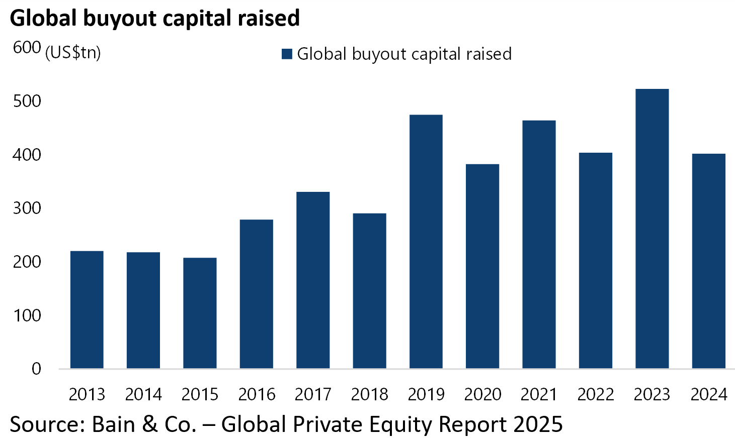 The latest Bain report published in March this year now puts that same number at 29,000 (see Bain & Co. report: “Global Private Equity Report 2025”, 3 March 2025).