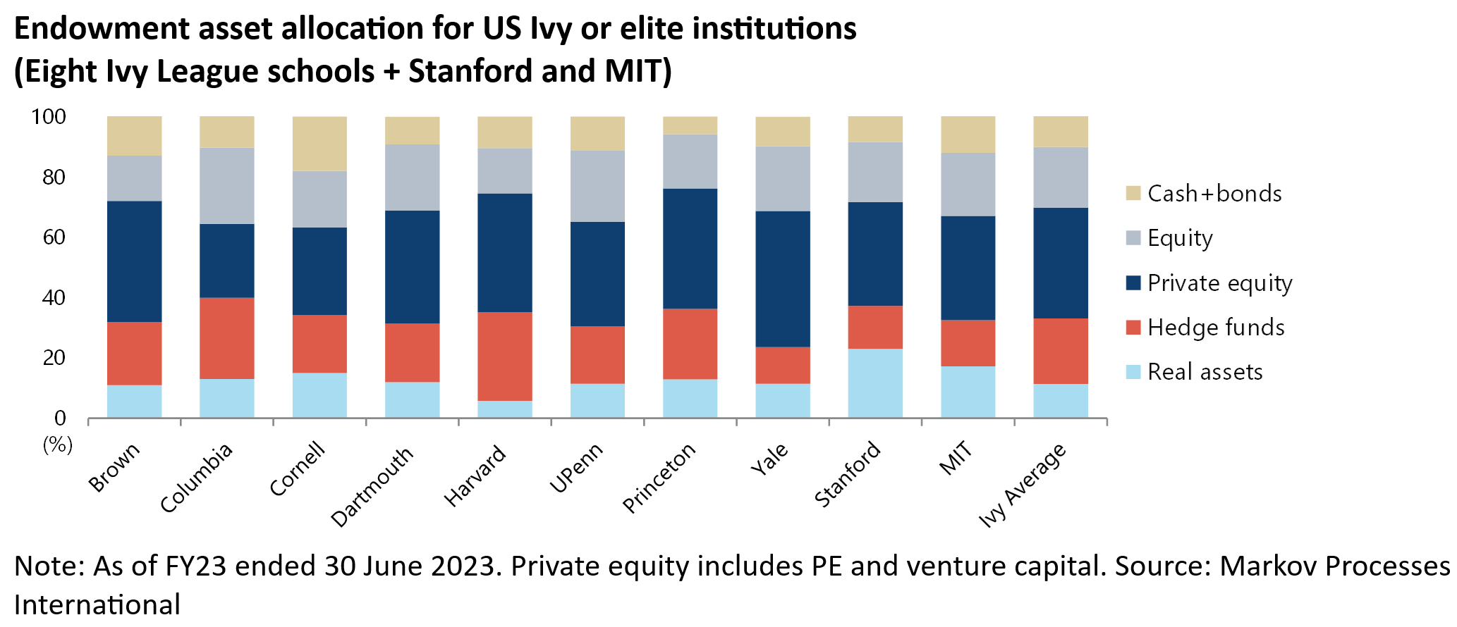 The Markov report estimated that at the end of fiscal year 2023, which is apparently 30 June for such institutions, the average Ivy League institution had 36.7% of its endowment in private equity (defined as PE and venture capital) based on an analysis of annual reports and financial statements.