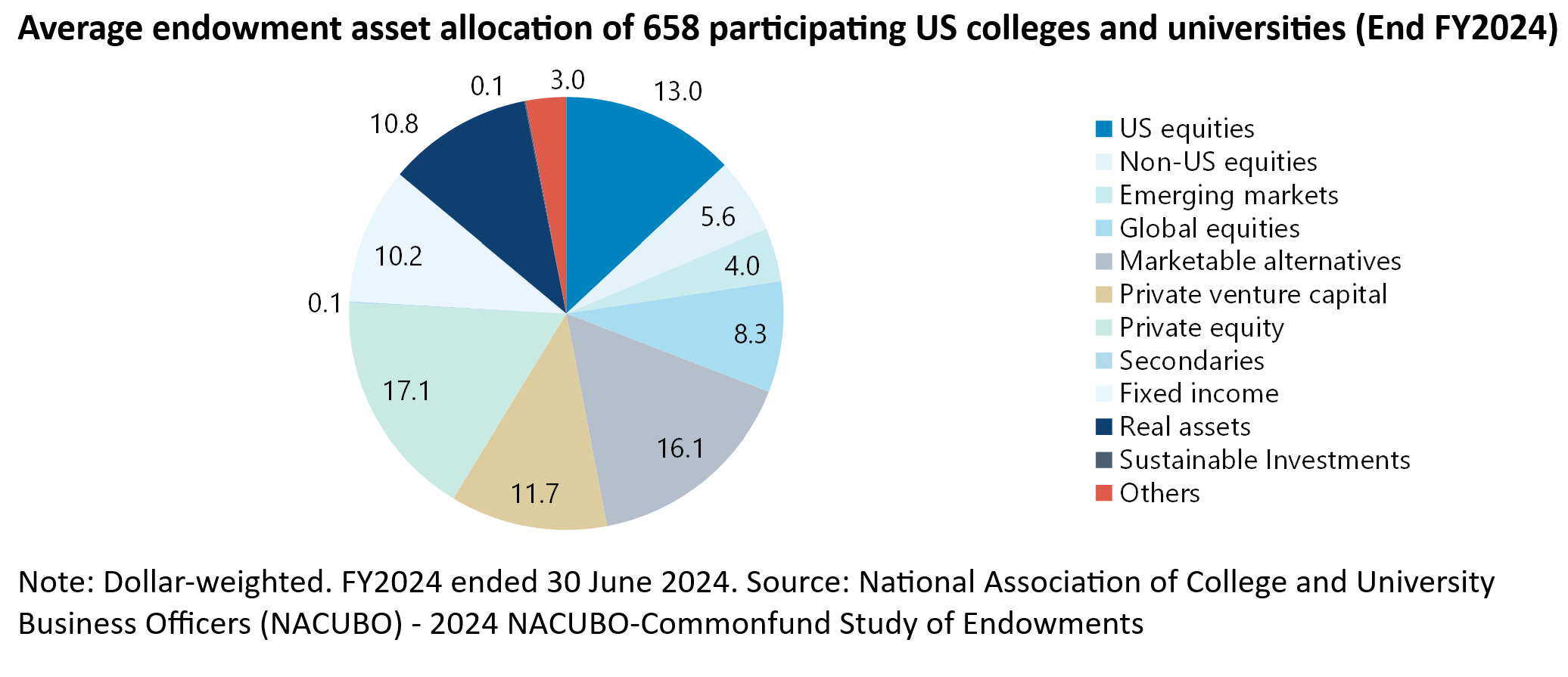 This also shows a similar asset allocation at the end of FY24 ended 30 June 2024 (see NACUBO report: “2024 NACUBO-Commonfund Study of Endowments”, 12 February 2025).