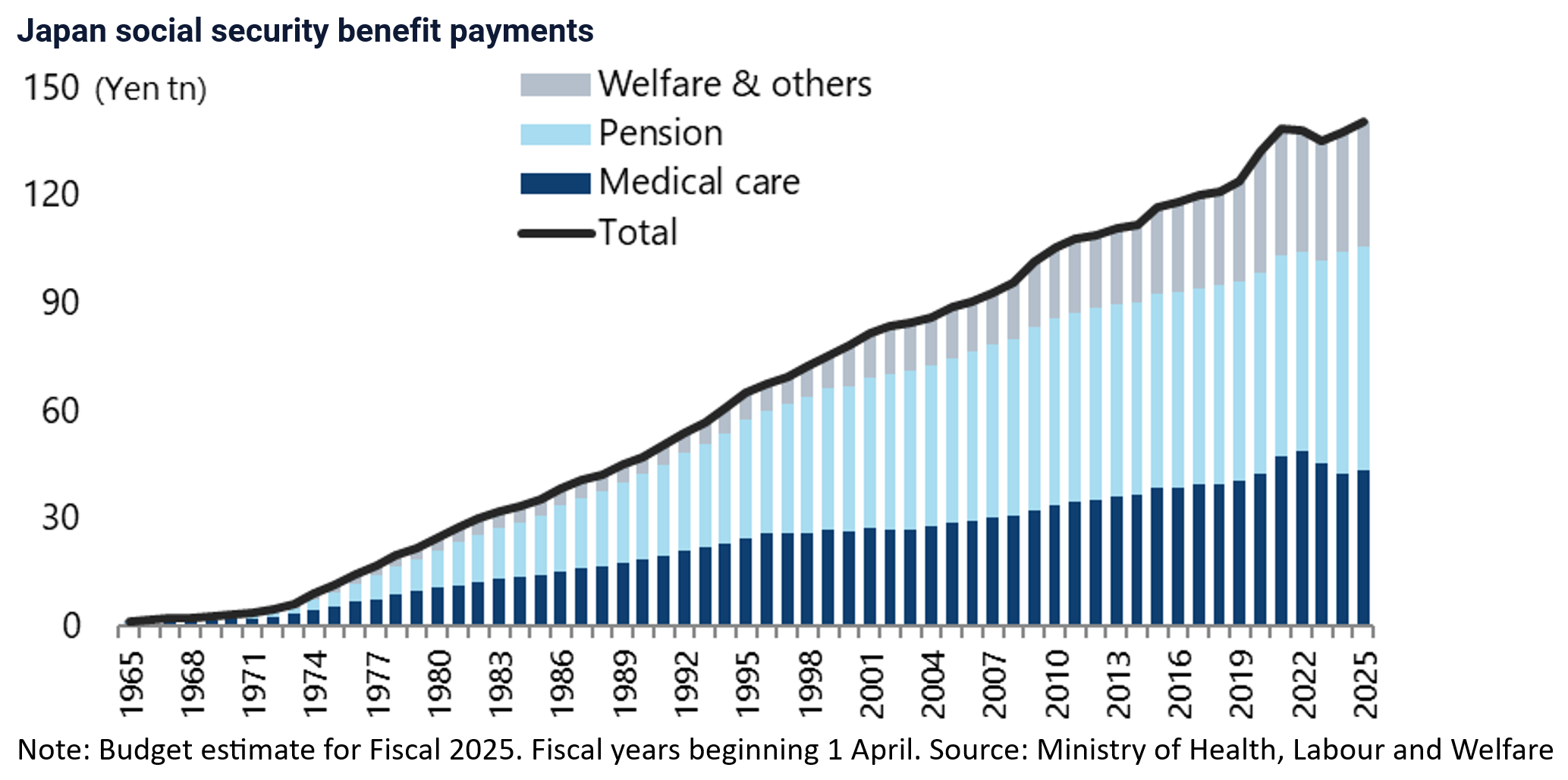 Thus, Japan is currently spending Y140tn or 22.4% of GDP a year on social security and healthcare, while working Japanese are paying 15% of their gross wages on contributions to social security, and their employers another 15%.