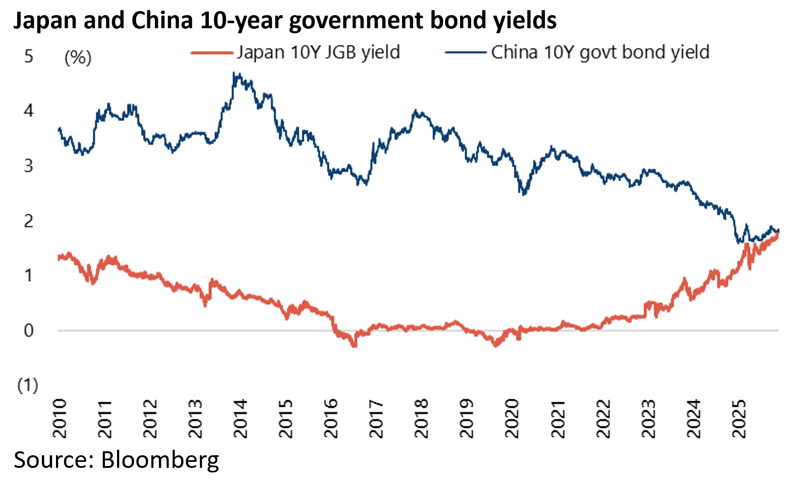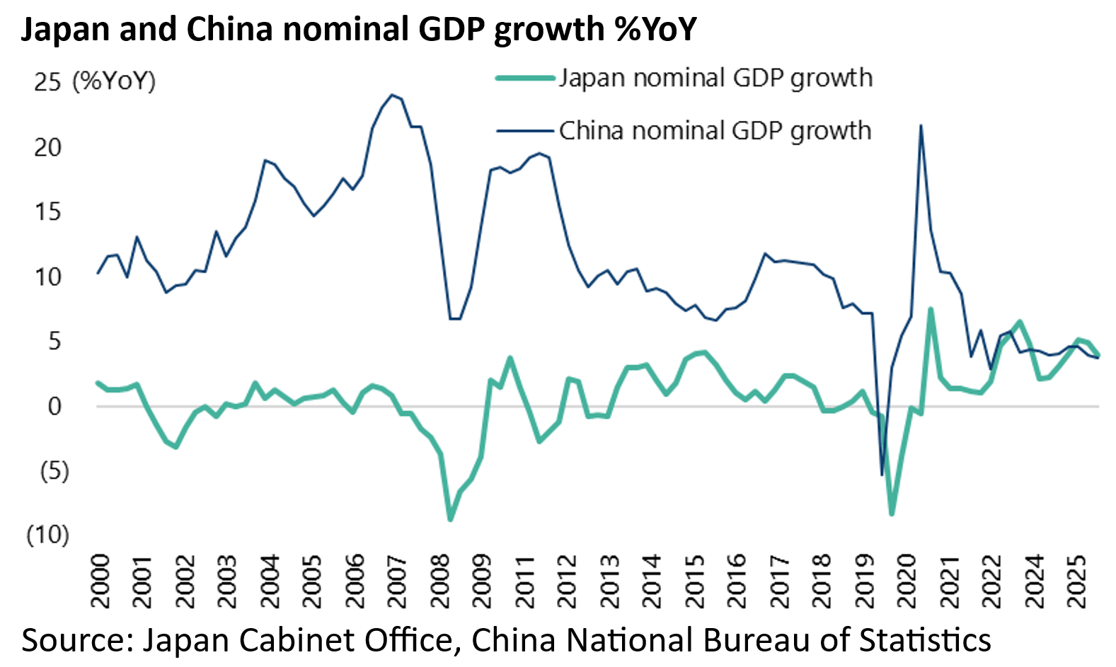 China nominal GDP slowed to 3.7% YoY in 3Q25, compared with 3.9% YoY in Japan.
