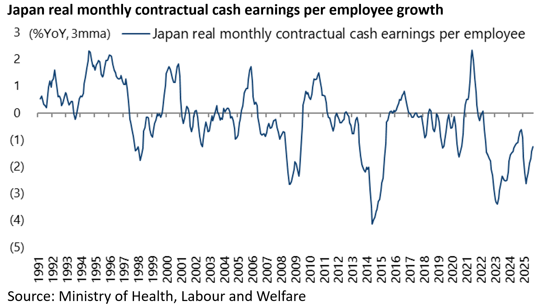 In Japan it remains the case that inflation is primarily driven by the cheap yen and this has continued to depress real wages. Real monthly contractual cash earnings per employee declined by an average 1.3% YoY in the three months to September.