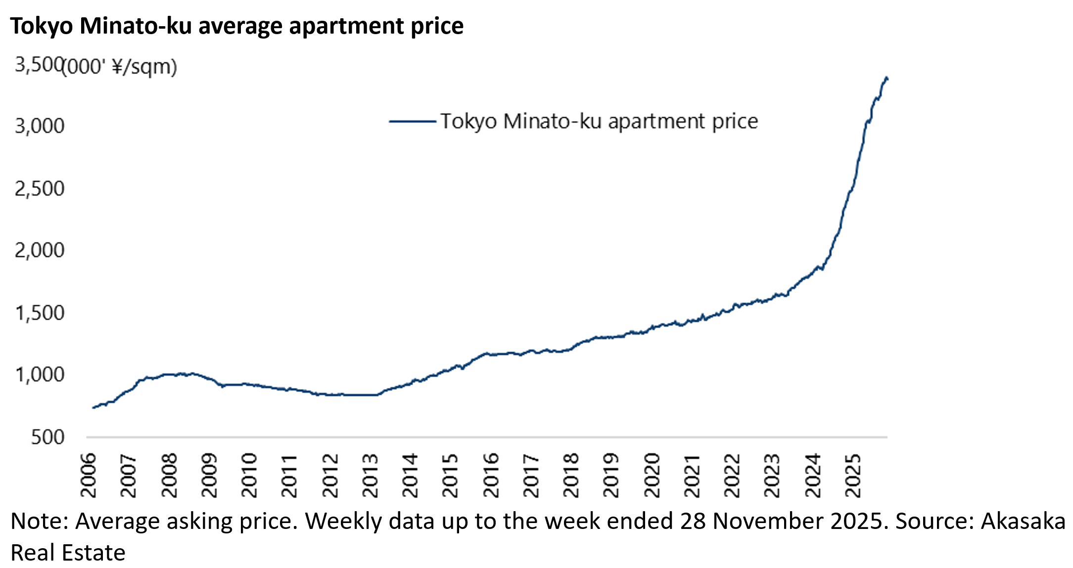 The average asking price of apartments in Minato-ku, the district known for its high-end condos, has risen by 40% over the past 12 months to Y3.4m/sqm, according to Akasaka Real Estate.