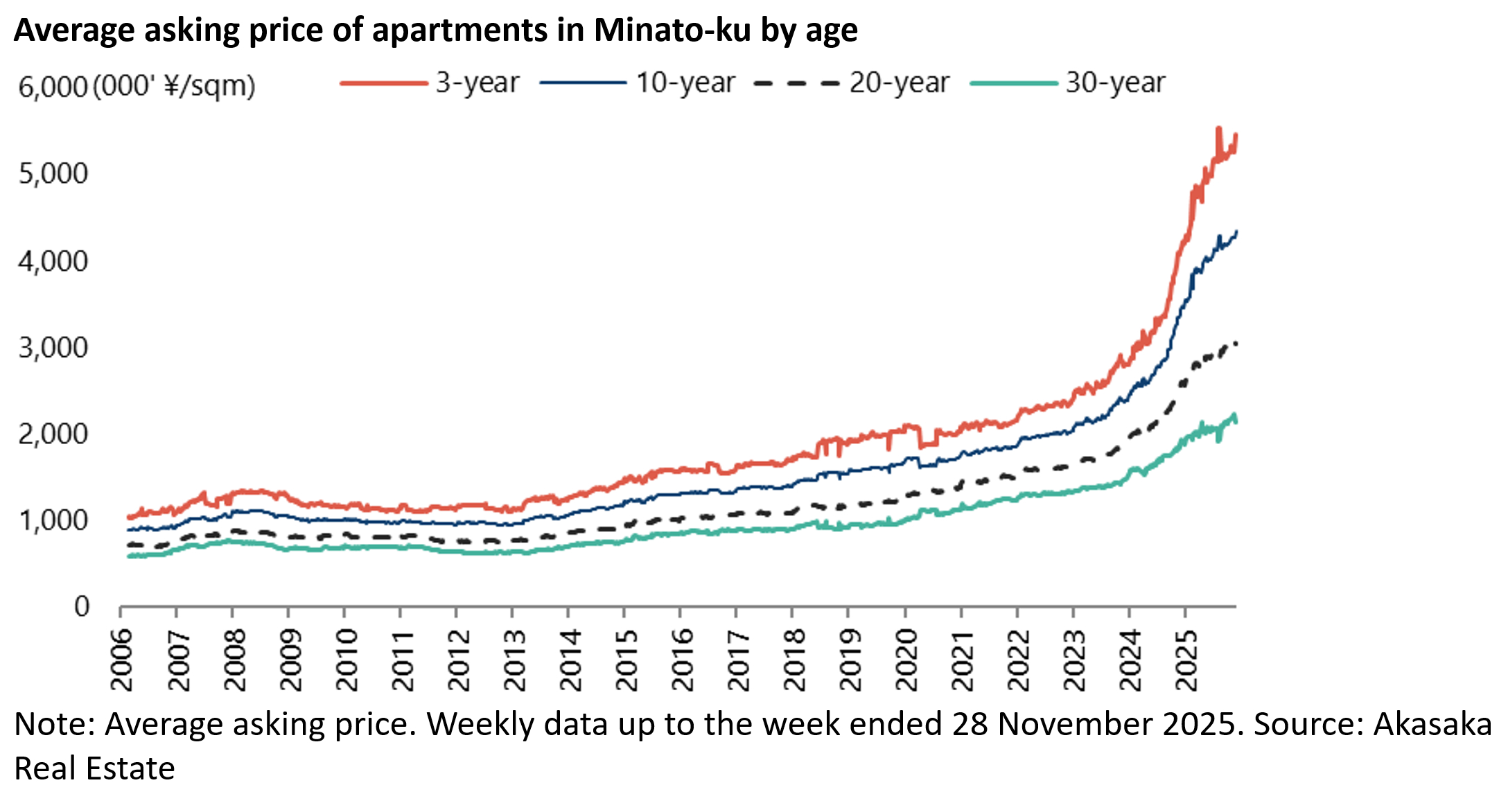 Thus, the average price of apartments aged three years or less in Minato-ku is now Y5.5m/sqm, or 2.6x the average price of Y2.1m/sqm for apartments aged 30 years and over.