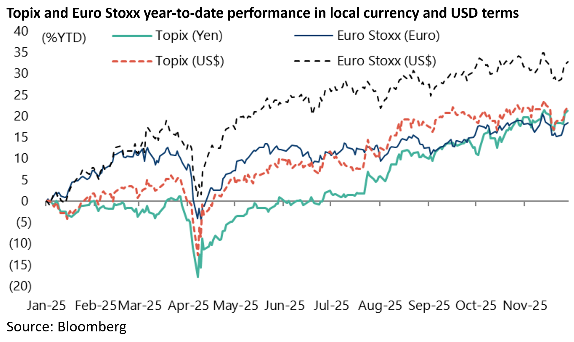 Thus, the Topix has risen by 21.3% year-to-date in yen terms and is up 22% in US dollar terms. By contrast, the Euro Stoxx Index is up 18.4% in euro terms and 32.7% in US dollar terms over the same period.
