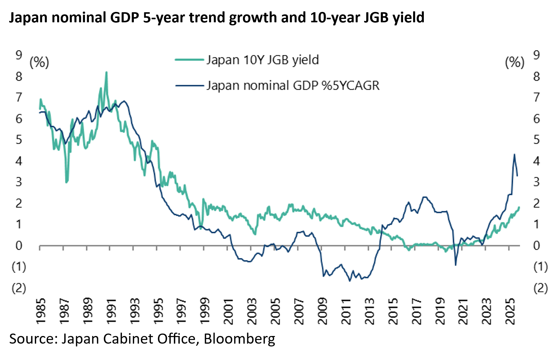 Japan nominal GDP rose by 3.9% YoY in 3Q25 and is up an annualised 3.3% over the past five years, up from an annualised 0.0% in the five years to 3Q22.